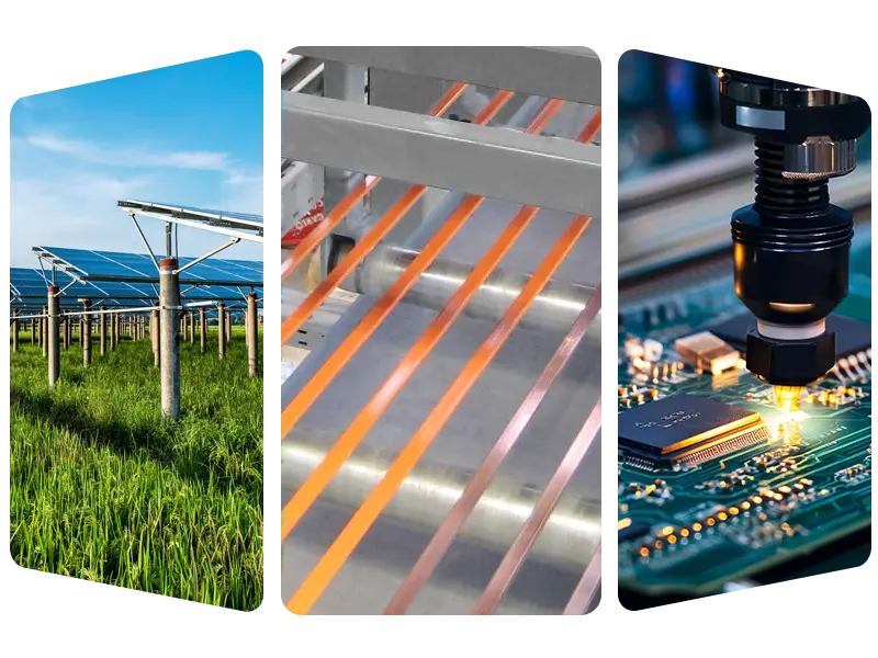 • Settore fotovoltaico: produzione in serie di nastri e busbar per saldatura fotovoltaica per aiutare i componenti a condurre l'elettricità in modo efficiente.